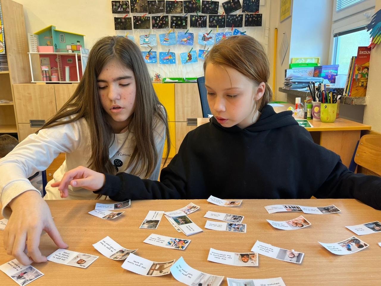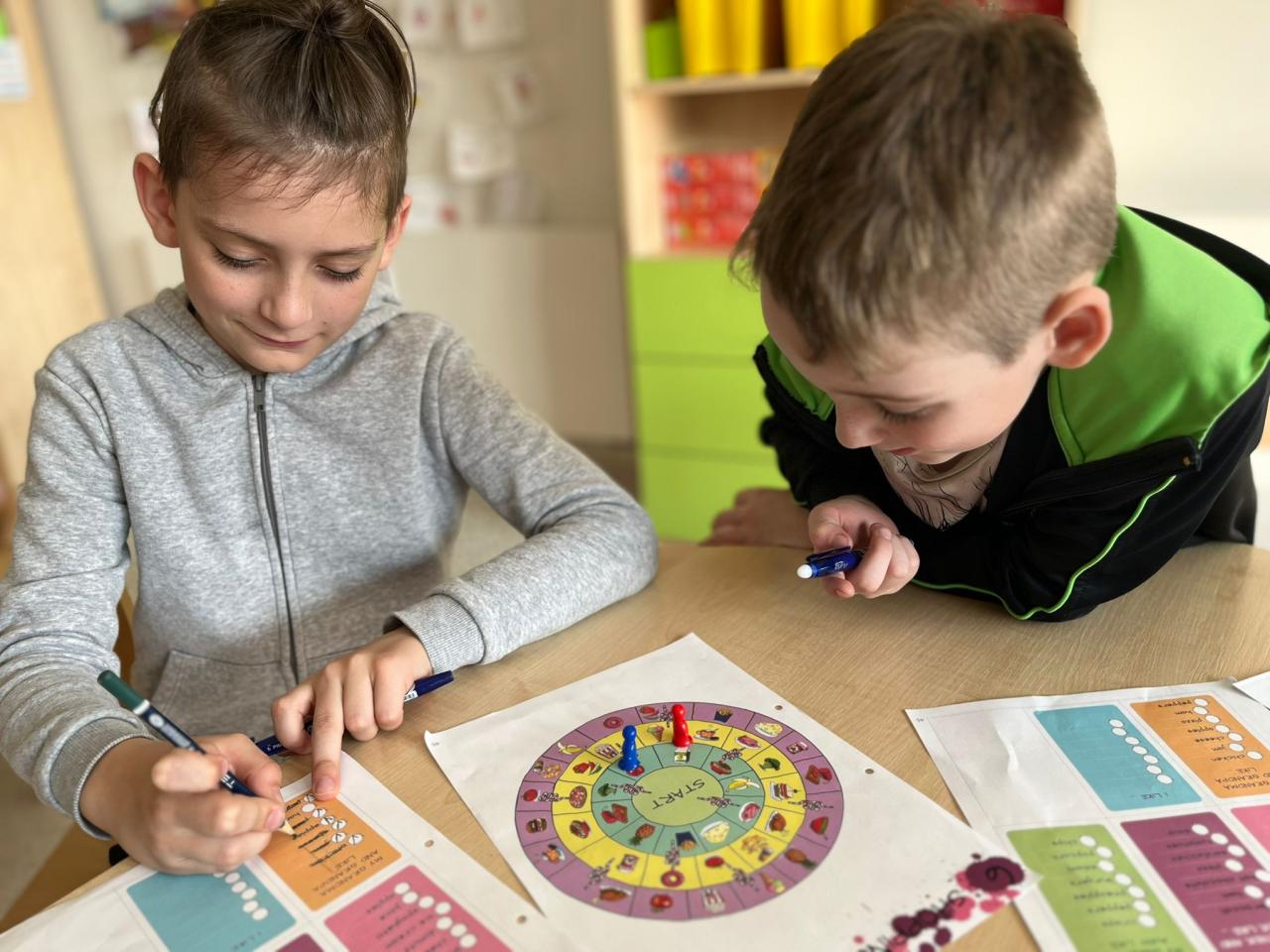 Do výuky pravidelně zařazujeme různé jazykové hry – "snapping game", plácačkovanou, tichou poštu nebo hry s obrázkovými kartičkami a dřívky. Učivo často opakujeme pomocí interaktivních kvízů, kde si děti procvičují slovíčka i celé fráze zábavnou formou.