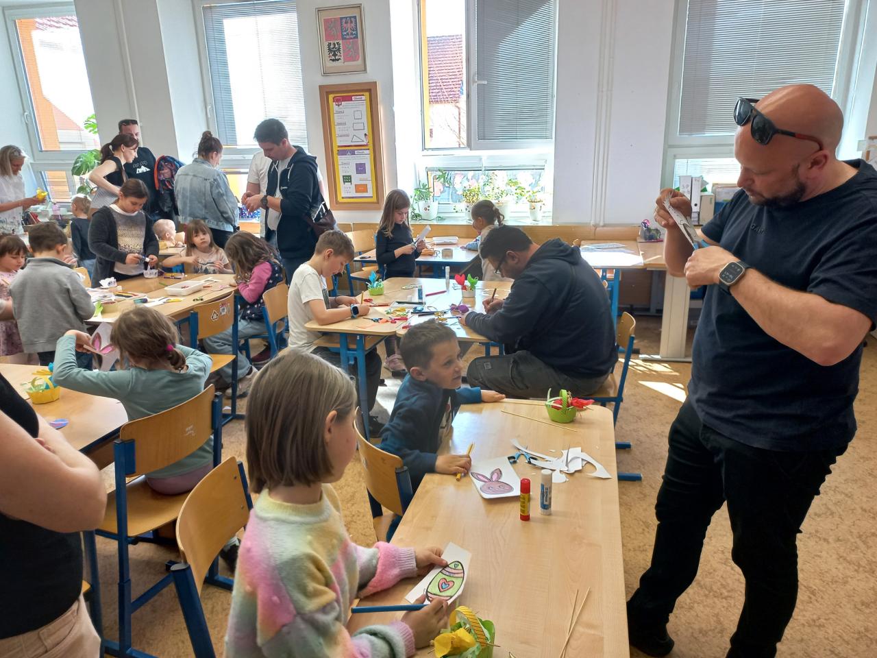 Děti spolu s rodiči tvořili v jedné třídě různobarevné zajíčky z polystyrenových vajíček a krepového papíru, papírové košíčky a zápichy do květináče s jarní tematikou, které si odnesli domů.