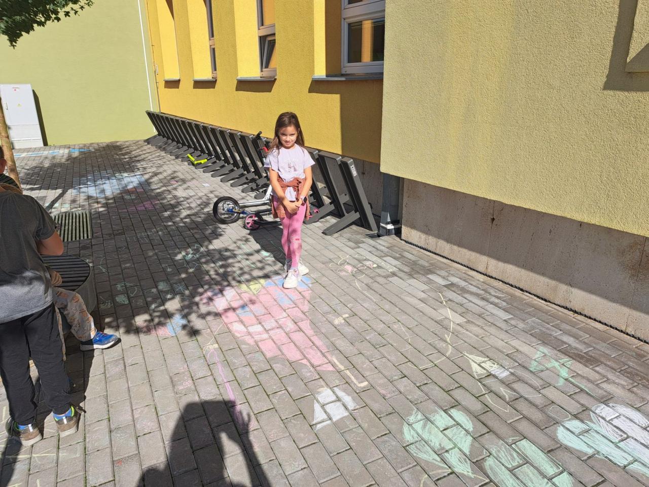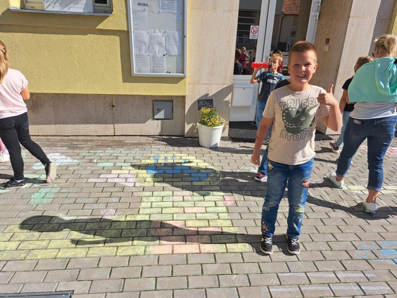 Děti si vzaly křídy a do práce se pustily s velikou chutí. Někdo chtěl mít svůj obrázek, jiné děti kreslily ve skupince, ale brzy jsme měli chodník plný kytek, stromů, zvířat, aut a dokonce se objevila i kosmická raketa. Díky slunečnému počasí nám vyzdobený chodník nějakou dobu vydržel, a tak mohli obrázky obdivovat i kolemjdoucí.