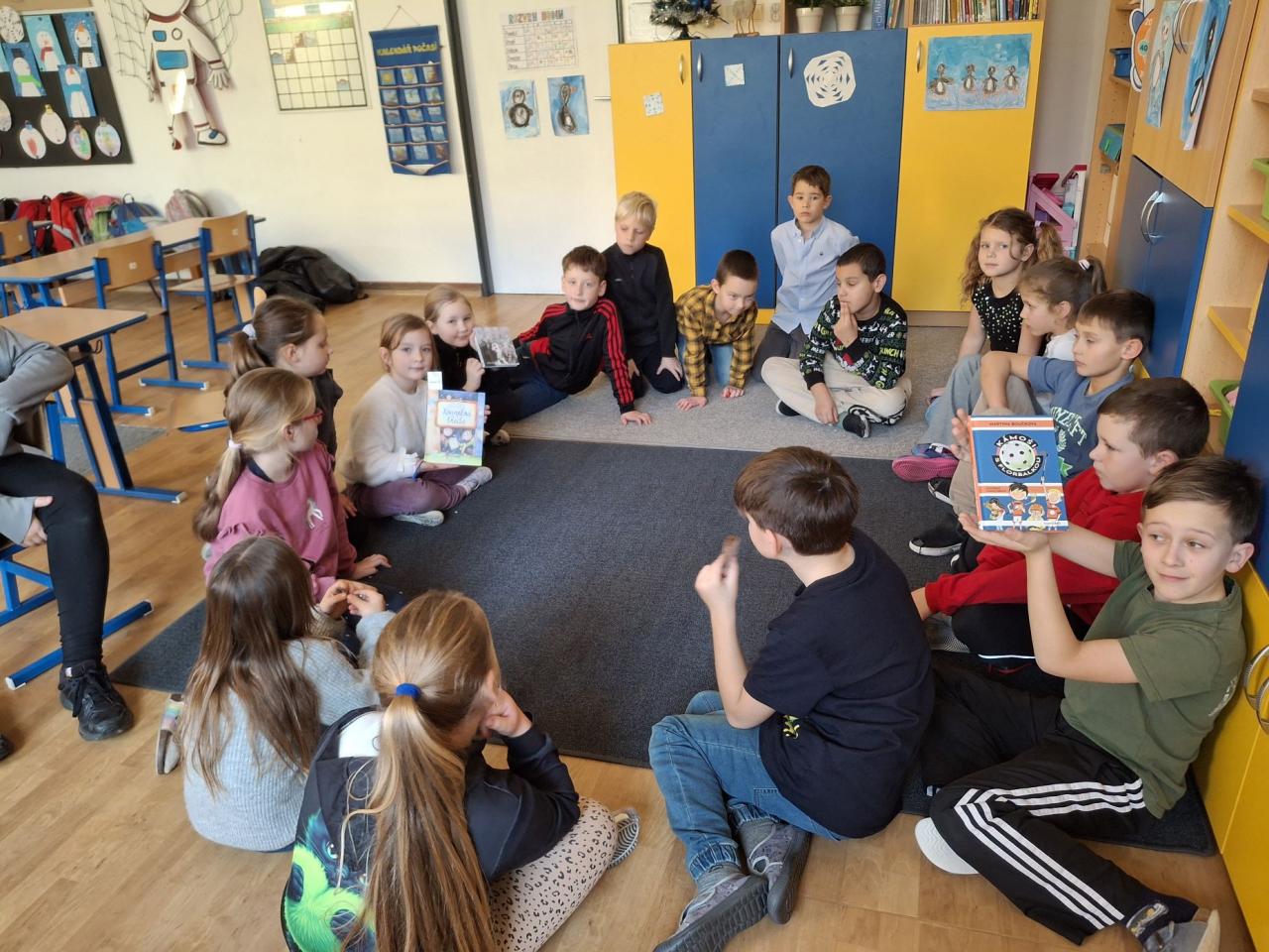 Protože v tento se děti neučily a zúčastnily se divadelního představení, měly s sebou místo školní tašky jen malý batůžek a mnohé z nich si svou knihu zapomněly vzít. A tak, aby nikdo nebyl smutný, pojali jsme nakonec naše odpoledne jako příjemné povídání o oblíbených knížkách, které děti čtou nebo už dokonce přečetly. A bylo zajímavé, že kromě nových knih o skřítcích, strašidlech, zvířátkách nebo knih se sportovní tematikou, děti nezapomínají ani na klasické tituly vydané před několika desítkami let jako třeba Děti z Bullerbynu nebo Rychlé šípy…