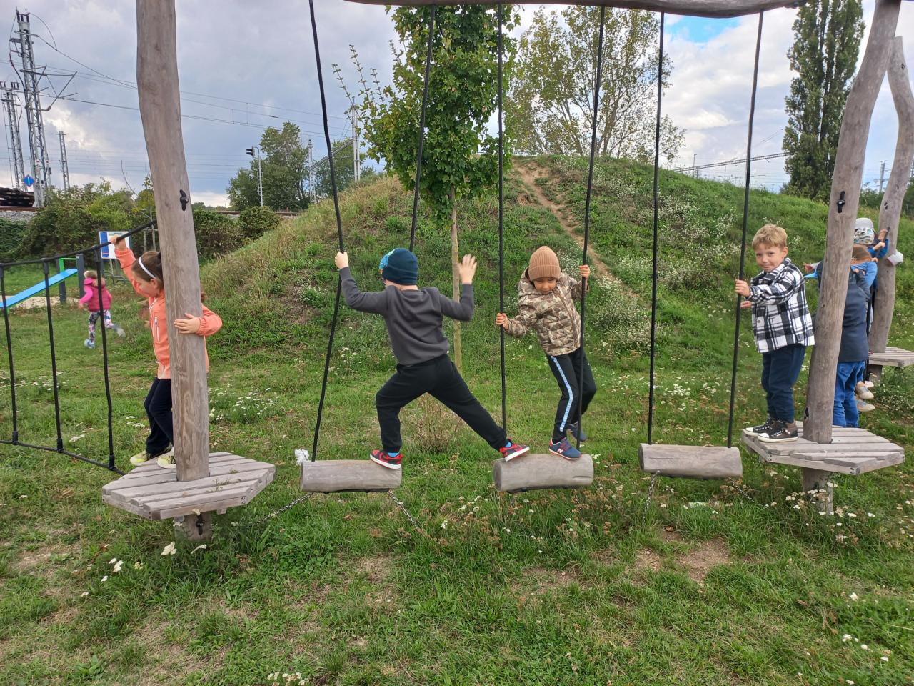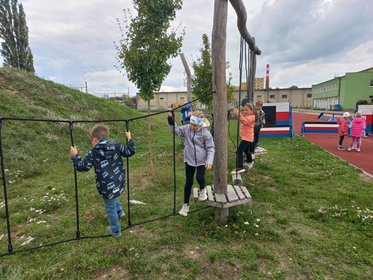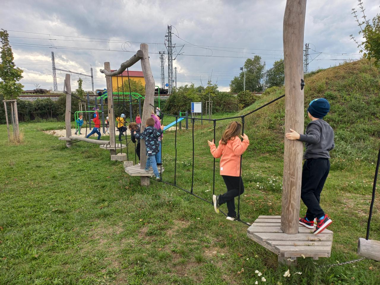 Společně jsme se vydali na procházku na hřiště za sportovním areálem, kde měly děti k dispozici dětské hřiště a workoutové prvky. V rámci aktivit jsme využili také hasičskou sportovní kladinu, kterou jsme zapojili do připravené překážkové dráhy. Dále děti získávaly kloboučky při skákání po jedné noze, při chůzi vzad, při „skocích žabáků“